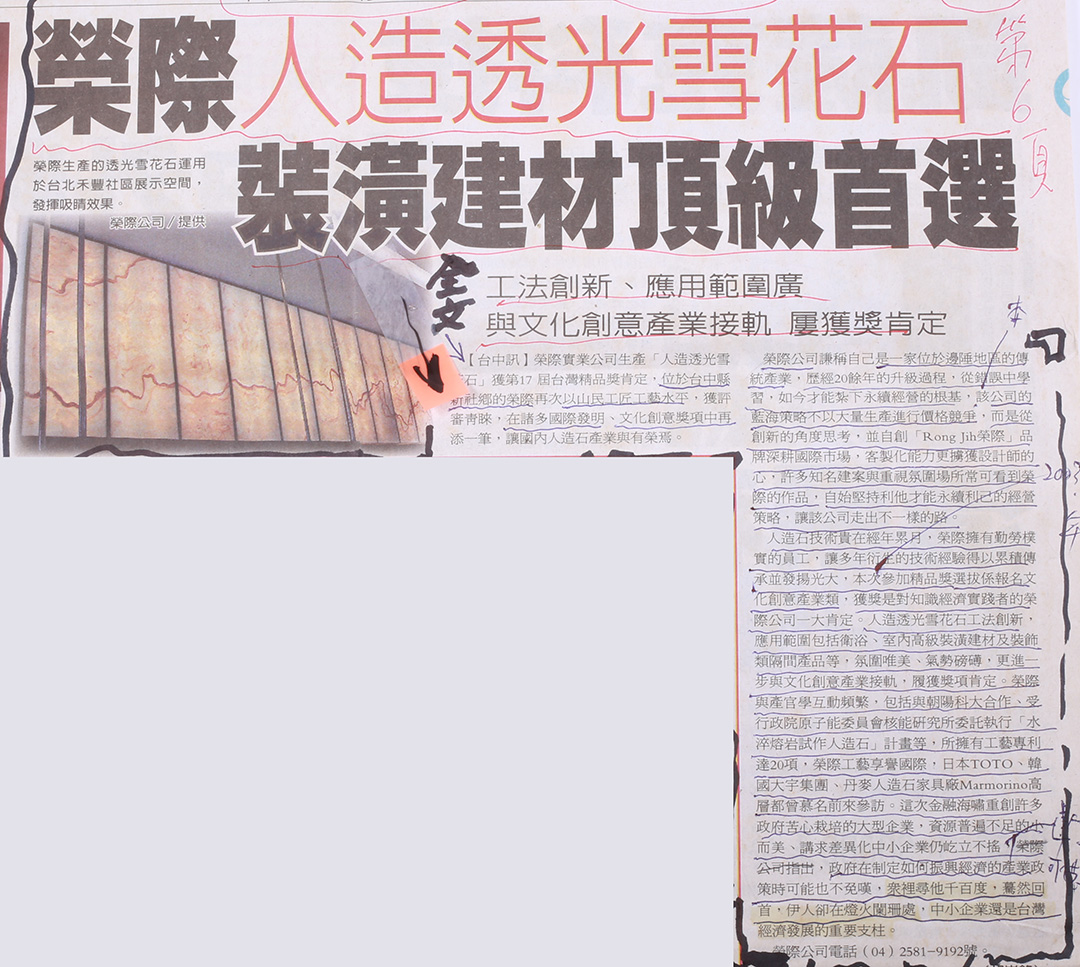 【台中訊】榮際實業公司生產「人造透光雪石」獲第17屆台灣精品獎肯定,位於台中市新社區的榮際再次以山民工匠工藝水平,獲評審青睞,在諸多國際發明、文化創意獎項中再添一筆,讓國內人造石產業與有榮焉。