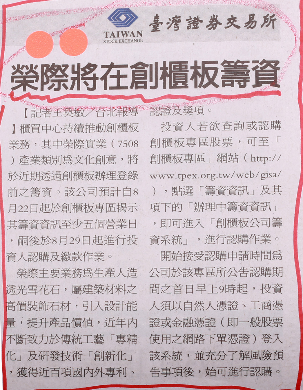 【記者王奐敏/苔北報導】櫃買中心持續推動創櫃板業務,其中榮際實業(7508)產業類別爲文化創意,將於近期透過創櫃板辦理登錄前之籌資。該公司預計自8月22日起於創櫃板專區揭示其籌資資訊至少五個營業日,嗣後於8月29日起進行投資人認購及繳款作業。