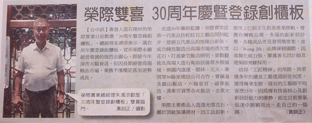 【台中訊】專營人造石建材的榮際實業日前歡慶「30周年暨登錄創櫃板」,總經理朱清涼表示,選在周年慶登錄創櫃板,宣示榮際永續經營發展的強烈企圖心,即使今年房市大幅衰退,但因長期經營高端精品市場,業務不僅穩定甚至逆勢成長。